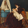 Stevens’ first child, Leopold, who was himself eventually to become a painter, was born in 1861 and the theme of maternity is quickly represented in the painter’s work, as one of the tenderest aspects of woman’s life. Nowhere is the theme realized with greater sincerity and beauty than in Tous les bonheurs, one of the painter’s earliest and greatest masterpieces. That Stevens used this theme infrequently probably testifies to the strength of his conviction that it not be cheapened, for twice in his Impressions on Painting of 1886 he comments on its greatness: “Painters are to be pitied who have not deigned or have not known how to sing of woman and child” and “all the masters have painted the Virgin and the Infant Jesus. It is always a mother and her son, and this will be an admirable subject to all eternity.” The painting of the Virgin and Child which hangs within the curtain of the cradle in Tous les bonheurs serves to enforce the parallel and to underscore the timelessness of maternal devotion, whether it be in a humble cottage or in an elegant interior.
