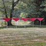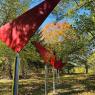 Five Triangles exemplifies Phillips’ long engagement with geometric form and motion in space. Here five identical red triangles, each mounted on slender stainless-steel poles, spin freely with the wind, an elegant synthesis of order and variability. The repetition of shape establishes a visual rhythm, solidifying the work as a cohesive whole, yet the kinetic element ensures that no two moments are the same. Each triangle turns independently, introducing an ever-changing relationship between the parts.