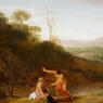 The theme of Diana and her Nymphs was often depicted by Poelenburch. In our work the discovery of Callisto has been included. Stemming from Ovid’s Metamorphoses Diana, identifiable by the crescent moon worn across her brow, is seated on a rock with three of her nymphs drying themselves after their bath. A huntress, Diana’s attributes of a bow and arrow are cast aside in the mid-ground. She was also the personification of Chastity and the nymphs were expected to follow her example. Callisto, one of Diana’s nymphs, was seduced by Jupiter and became pregnant. Depicted alongside the pool in the center is the discovery of her condition by another nymph. Afterwards as punishment Diana changed Callisto into a bear and set her dogs upon her. At the last moment Jupiter rescued her, sending her into the heavens and transformed her into a star. Poeleburch’s emphasis in these works was not on the moral but the sensual. Placed in a sun-filled Arcadian landscape dominated by gently rolling hills the viewer’s eye is intended to linger on the voluptuousness of its inhabitants The panel presents a sweep of flesh from the emerging bathing nymphs in the far left, to the mid-ground scene that culminates with Diana and her acolytes on a hill in the right foreground. Blonds, redheads, brunettes and raven-haired beauties are all represented. Supple skin is nicely contrasted against silky wraps that provide scant covering. Befitting her stature as a goddess, Diana is made the most alluring with alabaster skin that shines forth like a beacon of light. These types of scenes were especially popular; eventually morphing into generalized themes of nymphs or shepherdesses bathing, and became the mainstay of Poelenburch’s production. The tranquility of his settings, accentuated by vibrant color, combined with invisible brush-work that was finished in a high-gloss veneer proved irresistible, earning him the title of the “leading light of the first generation of Dutch Italianate painters”.