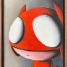 Red Hero typifies Plans’ signature blend of childlike innocence and psychological depth. The figure, rendered in the artist’s distinctive cartoon-inspired style, features an oversized head, wide white eyes, and a simplified red costume surmounted by pointed ears, recalling his recurring “hero” motif. Against a softly shaded gray background, the bright crimson figure radiates a sense of quiet courage, while its wide eyes convey both vulnerability and a heightened, almost watchful alertness. Plans’ use of expressive minimalism, playful proportions, and subtle shading gives emotional weight to his whimsical subjects, inviting viewers to reflect on inner strength, imagination, and the purity of youthful ideals.