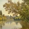 Set along a serene bend of the Seine, this landscape reflects the naturalistic, plein-air tradition that shaped Léon Joubert’s work, echoing the tonal subtlety and compositional balance associated with late-Barbizon and post-academic French landscape painting. A sweeping tree dominates the right side of the canvas, its gold-flecked leaves rendered with measured, textural brushwork that suggests careful observation rather than impressionistic spontaneity. Across the river, soft, harmonious greens dissolve into a cluster of village rooftops and a church tower, their forms gently veiled by atmospheric distance.