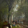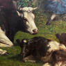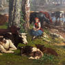 Based in New York City, James McDougal Hart-like his brother William-painted in the style of the Hudson River School. Unlike his brother, who painted mostly small and mid-sized works, James favored painting larger landscapes, a likely result of his exposure to the large realist works of the Düsseldorf School. He was known for his renderings of livestock, specifically cattle. His major landscapes are considered some of the most important works to come out of the Hudson River School; a notable example is his Summer in the Catskills, now in the Thyssen-Bornemisza Museum in Madrid.