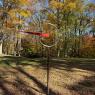 One of Roger Phillips’s striking kinetic sculptures rises to 107 inches, embodying his mastery of balance, motion, and refined engineering. A single, vertical pole anchors the work, providing a stable yet elegant spine for its components. Suspended on this pole is a large circular element, pierced by a single wedge-shaped piece that moves independently, tracing arcs and shifting its angle as it responds to air currents. Painted a vibrant red, the sculpture combines visual boldness with mechanical subtlety: the contrast between the static pole and the rotating wedge creates a dynamic interplay of form, shadow, and movement. The sculpture exemplifies Phillips’s approach, carefully engineered, visually clear, and animated with continuous, flowing motion, transforming simple geometric forms into a living, kinetic composition that engages both the eye and the surrounding space.